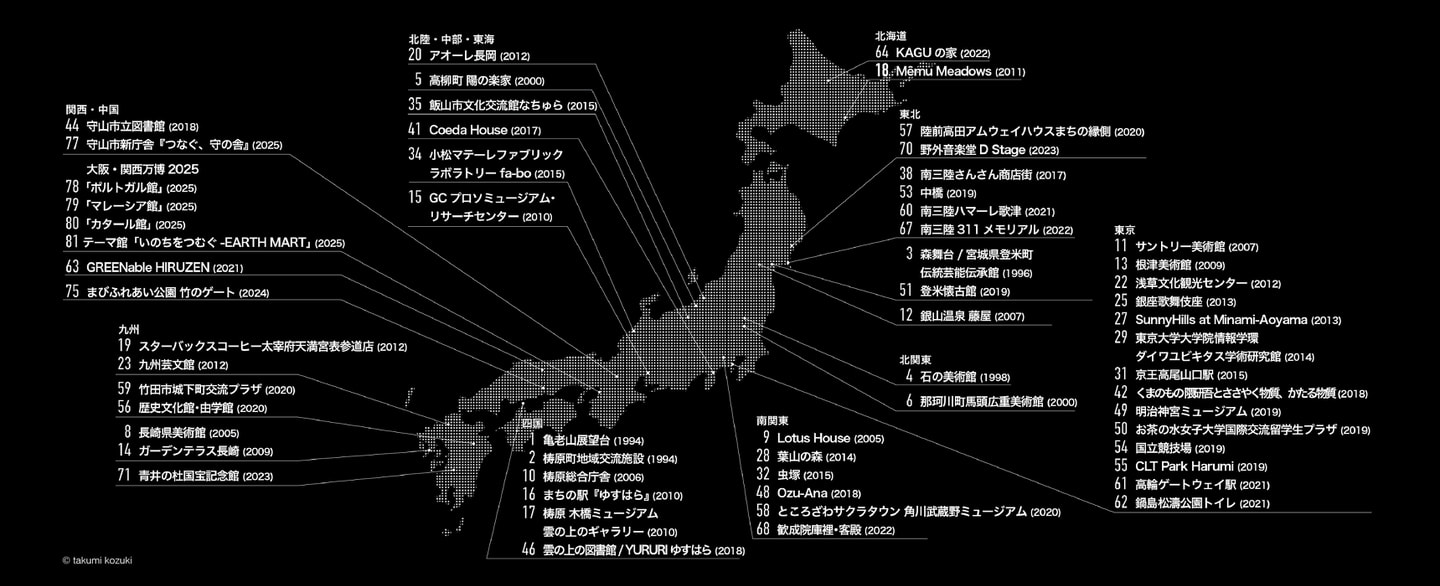 建築家/東京大学特別教授・名誉教授1954年神奈川県生まれ。東京大学卒業後、コロンビア大学研究員を経て、1990年隈研吾建築都市設計事務所を設立。主な作品に「森舞台/宮城県登米町伝統芸能伝承館」「那珂川町馬頭広重美術館」「アオーレ長岡」「ブザンソン芸術文化センター」「国立競技場」「Odunpazarı Modern Museum」「中橋」「青井の杜国宝記念館」「UCCA陶美術館」など。著書に「10宅論」(ちくま文庫)、「負ける建築」(岩波文庫)、「小さな建築」「自然な建築」「日本の建築」(以上、岩波新書)、「建築家になりたい君へ」(河出書房新社)など。